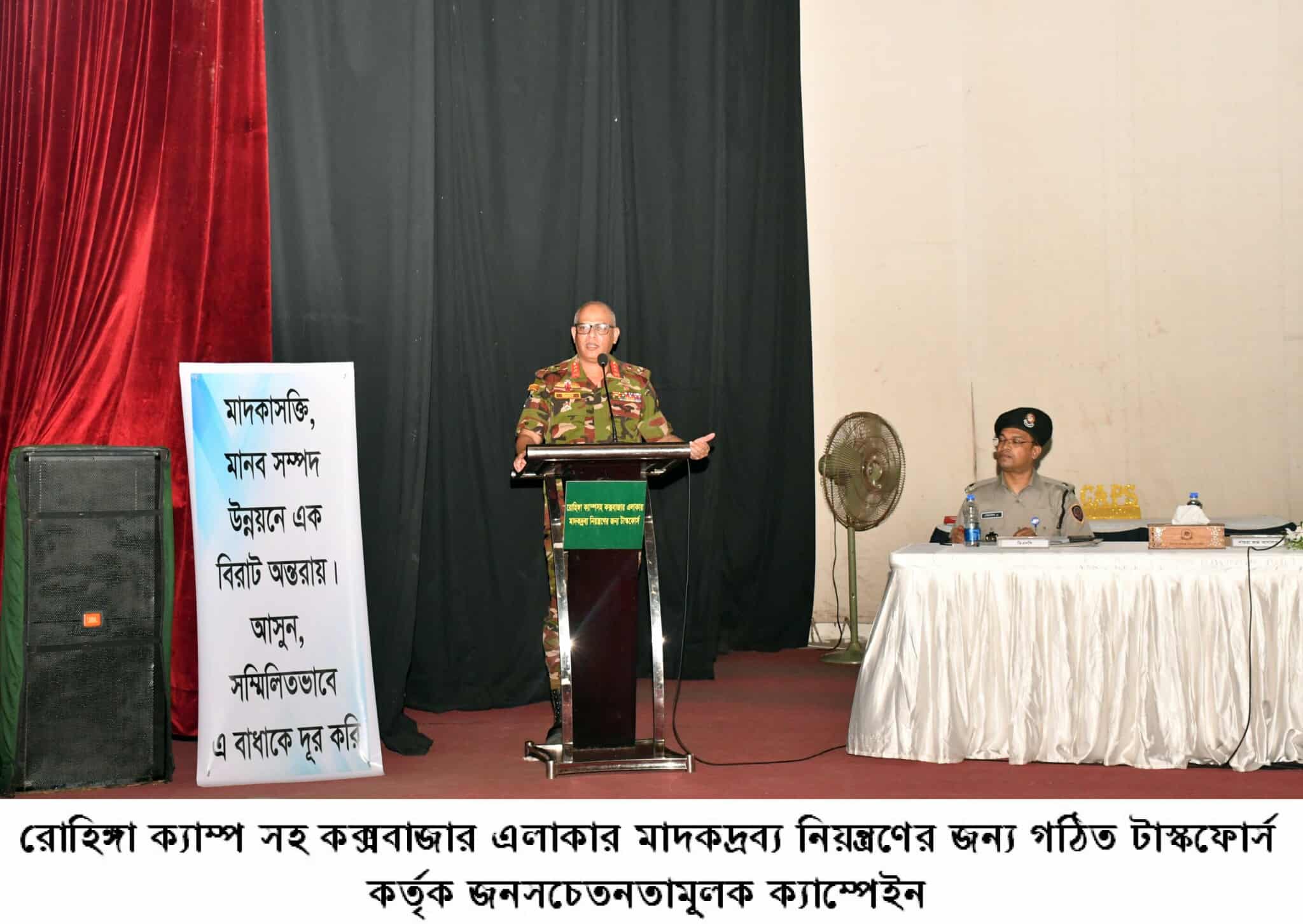 ঈদগাঁও প্রতিনিধি, কক্সবাজার। 'রোহিঙ্গা ক্যাম্পসহ কক্সবাজার এলাকায় মাদক দ্রব্য নিয়ন্ত্রণের জন্য গঠিত টাস্কফোর্স' এর তত্ত্বাবধানে মাদক চোরাচালান এবং মাদকের ব্যবহার রোধে এক সামাজিক সচেতনতা ক্যাম্পেইন অনুষ্ঠিত হয়েছে। কক্সবাজার সাংস্কৃতিক কেন্দ্রে আয়োজিত অনুষ্ঠানে প্রধান অতিথি ছিলেন বাংলাদেশ সেনাবাহিনীর ১০ পদাতিক ডিভিশনের জিওসি মেজর জেনারেল মোহাম্মদ আসাদুল্লাহ মিনহাজুুল আলম। এতে বক্তারা মাদকের বিরুদ্ধে সামাজিক সচেতনতার ওপর গুরুত্বারোপ করে বলেন, সচেতনতা বৃদ্ধি পেলে মানুষ মাদক থেকে বিরত থাকবে, কারবারিদের বিরুদ্ধে সামাজিক প্রতিরোধ গড়ে তুলবে এবং আইনশৃঙ্খলা বাহিনীকে সহায়তা করবে। দীর্ঘমেয়াদে এটি সামাজিক আন্দোলনে পরিণত হয়ে ভবিষ্যৎ প্রজন্মকে মাদকের ভয়াল থাবা থেকে রক্ষা করবে। ক্যাম্পেইনে পুলিশের ঊর্ধ্বতন কর্মকর্তাবৃন্দ, একাধিক উপজেলা নির্বাহী কর্মকর্তাগণ, এসিল্যান্ড, ডাক্তার, নির্বাচিত কলেজের অধ্যক্ষ এবং স্কুল ও মাদ্রাসাসমূহের প্রধান শিক্ষকগন, স্বাস্থ্যকর্মী, ধর্মীয় শিক্ষক, ছাত্র-ছাত্রী প্রতিনিধি, স্থানীয় গণ্যমান্য ব্যক্তিবর্গ ও গণমাধ্যম ব্যক্তিবর্গ উপস্থিত ছিলেন।