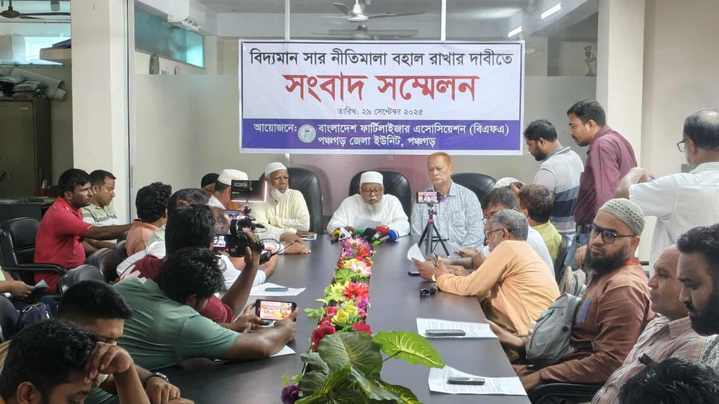 ওয়ার্ড ভিত্তিক সার ডিলার নিয়োগ না দিয়ে বিদ্যমান সার নীতিমালা বহাল রাখার দাবিতে পঞ্চগড়ে সংবাদ সম্মেলন অনুষ্ঠিত হয়েছে। সোমবার দুপুরে পঞ্চগড় চেম্বার অব কমার্স অ্যান্ড ইন্ডাস্ট্রির হলরুমে বাংলাদেশ ফার্টিলাইজার এসোসিয়েশন (বিএফএ) এই সংবাদ সম্মেলনের আয়োজন করে।