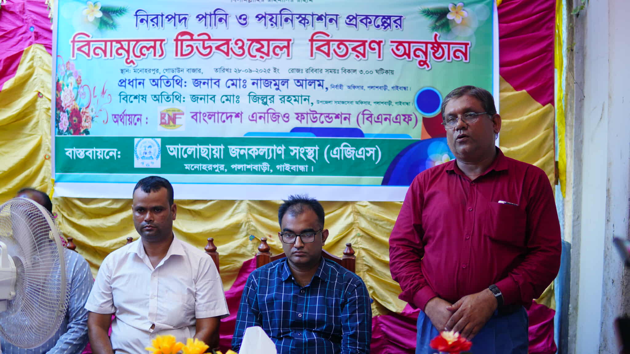 গাইবান্ধার পলাশবাড়ী উপজেলার মনোহরপুর ইউনিয়নের গোডাউন বাজারে আলো ছায়া জনকল্যাণ সংস্থা (এজিএস)-এর বাস্তবায়নে এবং বাংলাদেশ এনজিও ফাউন্ডেশন (বিএনএফ)-এর অর্থায়নে নিরাপদ পানি ও পয়ঃনিষ্কাশন প্রকল্পের আওতায় ১১টি দুস্থ ও হতদরিদ্র পরিবারের মাঝে বিনামূল্যে টিউবওয়েল বিতরণ কার্যক্রম অনুষ্ঠিত হয়েছে।