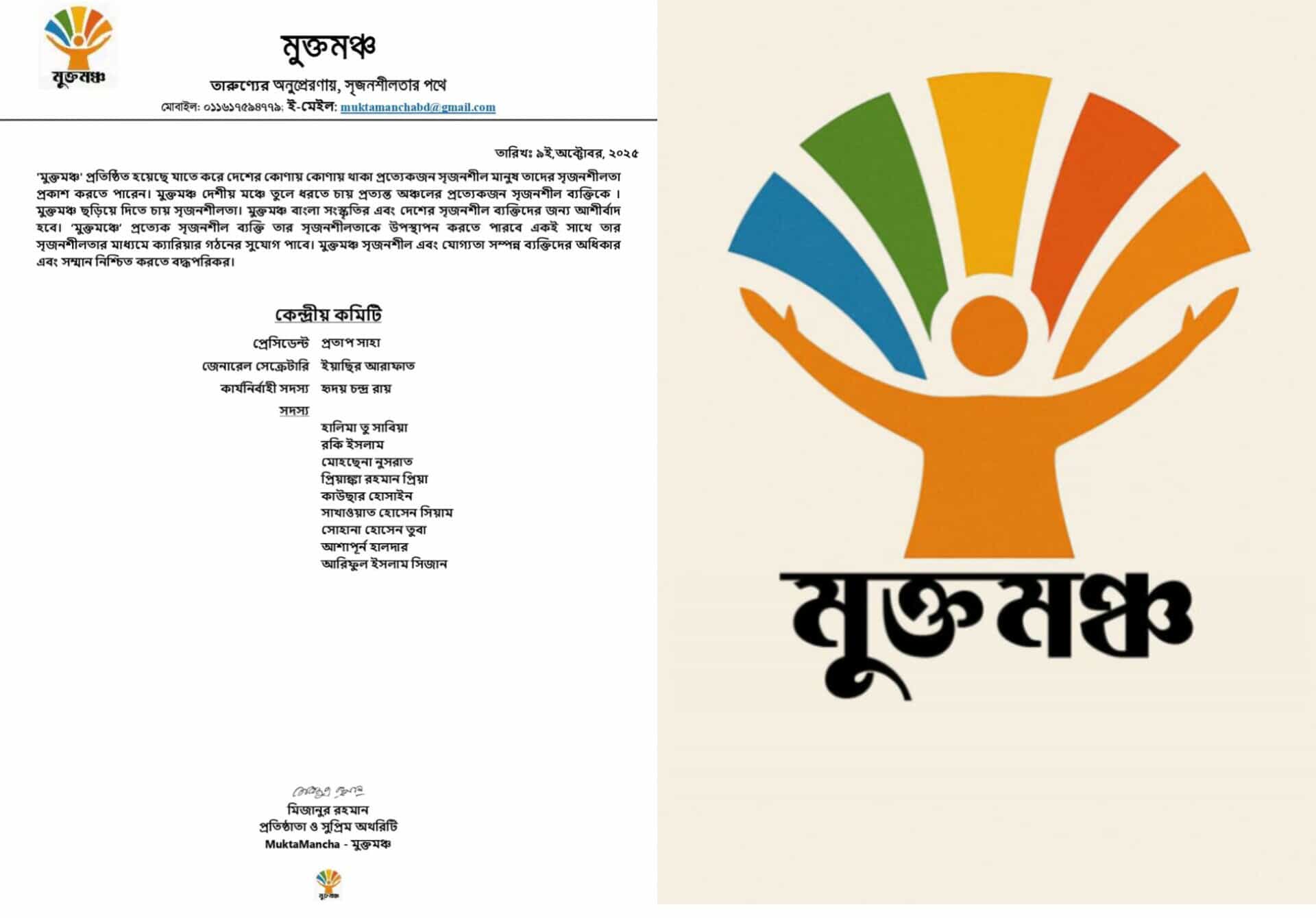 স্টাফ রিপোর্টারঃ- দেশব্যাপী মুক্তচিন্তা ও সৃজনশীলতার বিকাশে কাজ করা সংগঠন ‘মুক্তমঞ্চ’ তাদের কেন্দ্রীয় কমিটি ঘোষণা করেছে। নবগঠিত কমিটিতে প্রতাপ সাহা সভাপতি ও ইয়াছির আরাফাত সাধারণ সম্পাদক হিসেবে দায়িত্ব পেয়েছেন। এছাড়া কার্যনির্বাহী সদস্য হিসেবে আছেন হৃদয় চন্দ্র রায়। কমিটির অন্যান্য সদস্যরা হলেন — হালিমা তু সাবিয়া, কাউছার হোসাইন,আশাপূর্ন হালদার,মোহছেনা নুসরাত,প্রিয়াঙ্কা রহমান প্রিয়া,সোহানা হোসাইন তুবা,আরিফুল ইসলাম সিজান,রকি ইসলামক,সাখাওয়াত হোসেন সিয়াম। ‘মুক্তমঞ্চ’-এর প্রতিষ্ঠাতা ও সর্বোচ্চ কতৃপক্ষ মিজানুর রহমান বলেন,“মুক্তমঞ্চ দেশের তরুণ সমাজকে যুক্তিবাদ, মানবিকতা ও সৃজনশীলতার চর্চায় উদ্বুদ্ধ করতে কাজ করছে। প্রত্যেকে নিজের অবস্থান থেকে সৃজনশীল ভূমিকা রাখলেই সমাজে ইতিবাচক পরিবর্তন সম্ভব।” সংগঠনটি ভবিষ্যতে মুক্তচিন্তা, সাহিত্য, সংস্কৃতি ও সামাজিক দায়বদ্ধতা নিয়ে বিভিন্ন কর্মসূচি হাতে নেবে বলে জানানো হয়েছে।