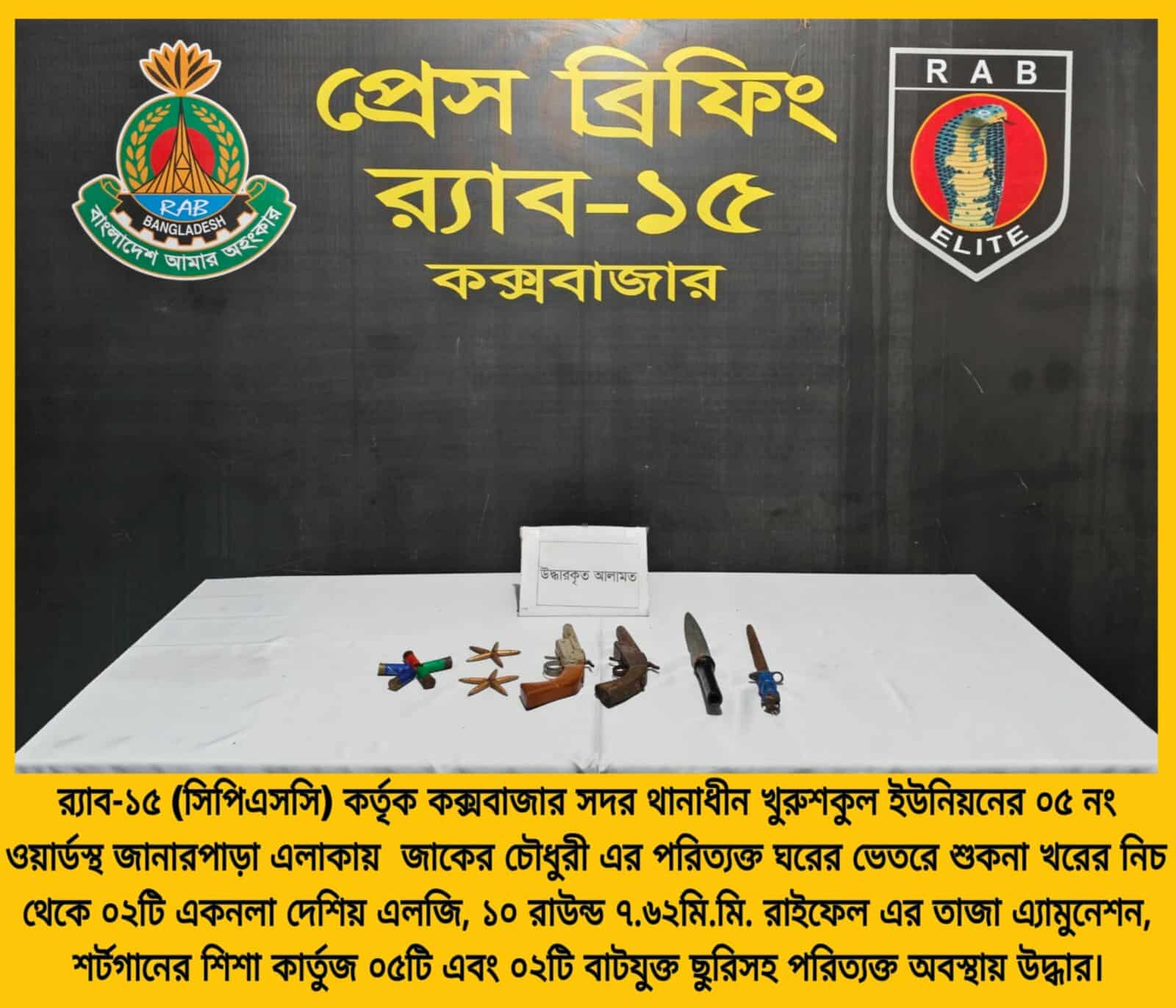 র্যাব- ১৫ এর সহকারী পুলিশ সুপার আ. ম. ফারুক স্বাক্ষরিত এক প্রেসবিজ্ঞপ্তিতে জানানো হয়, গোপন সংবাদের ভিত্তিতে জানার পাড়ার জাকের চৌধুরীর পরিত্যক্ত বাড়ীতে অভিযান চালিয়ে ২টি দেশীয় তৈরি এলজি, ১০ রাউন্ড তাজা গুলি, ৫টি শর্ট গানের তাজা সিসা কার্তুজ ও ২টি বাট যুক্ত ছুরি উদ্ধার করা হয়। এ সময় কাউকে আটক করা যায়নি । উদ্ধারকৃত অস্ত্র, গোলাবারুদের বিষয়ে পরবর্তী আইনি কার্যক্রম প্রক্রিয়াধীন রয়েছে বলে প্রেস বিজ্ঞপ্তিতে উল্লেখ করা হয়।