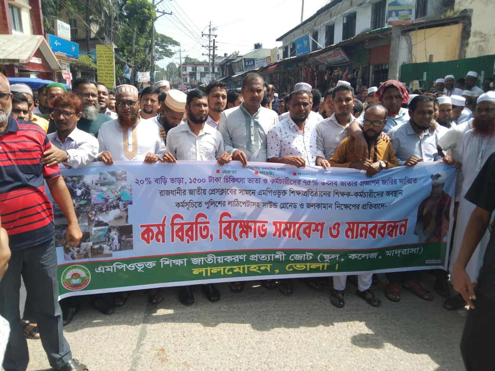 মুশফিক হাওলাদার বিশেষ প্রতিনিধি: জাতীয় প্রেসক্লাবের সামনে এমপিওভুক্ত শিক্ষক-কর্মচারীদের অবস্থান কর্মসূচিতে পুলিশের লাঠিপেটাসহ সাউন্ড গ্রেনেড ও জলকামান নিক্ষেপের প্রতিবাদে ভোলার লালমোহন উপজেলায় কর্মবিরতি, বিক্ষোভ সমাবেশ ও মানববন্ধন অনুষ্ঠিত হয়েছে। মঙ্গলবার সকালেন লালমোহন উপজেলা এমপিওভুক্ত শিক্ষা জাতীয়করণ প্রত্যাশী জোটের (স্কুল, কলেজ, মাদরাসা) উদ্যোগে লালমোহন বালিকা মাধ্যমিক বিদ্যালয় থেকে বিক্ষোভ মিছিল শুরু করে শহরের প্রধান প্রধান সড়ক প্রদক্ষিণ করে চৌরাস্তার মোড়ে গিয়ে শেষ হয়। সেখানে ঘন্টাব্যাপী মানববন্ধন অনুষ্ঠিত হয়। এতে বিভিন্ন শিক্ষাপ্রতিষ্ঠানের কয়েক হাজার শিক্ষক-শিক্ষার্থী ও অভিভাবকরা অংশগ্রহণ করেন। এ সময় বক্তারা বলেন, এমপিওভুক্ত শিক্ষা প্রতিষ্ঠানের শিক্ষক-কর্মচারীরা তাদের ন্যায্য দাবি আদায়ের জন্য জাতীয় প্রেসক্লাবের সামনে গত ১২ অক্টোবর পূর্বঘোষিত লাগাতার অবস্থান কর্মসূচিতে অংশগ্রহণ করেন। ওই দিন দুপুরের দিকে হঠাৎ শান্তিপূর্ণ কর্মসূচিতে পুলিশ শিক্ষকদের লাঠিপেটাসহ সাউন্ড গ্রেনেড ও জলকামান নিক্ষেপ করেন। এতে বেশ কয়েকজন শিক্ষক আহত হন। ন্যায্য দাবি আদায়ের জন্য রাজপথে দাঁড়ানো শিক্ষকদেরকে ফ্যাসিস্ট কায়দায় নির্যাতন করা হয়েছে। যারা এমন ঘৃণ কাণ্ড ঘটিয়েছে তাদের শনাক্ত করে দ্রুত আইনের আওতায় আনার দাবি জানানো হয়। একইসঙ্গে মানববন্ধন থেকে এমপিওভুক্ত শিক্ষাপ্রতিষ্ঠানের শিক্ষক-কর্মচারীদের ন্যায্য দাবি ২০% বাড়ি ভাড়া, ১৫০০ টাকা চিকিৎসা ভাতা ও কর্মচারীদের ৭৫% উৎসব ভাতার প্রজ্ঞাপন দ্রুত বাস্তবায়নের জন্য শিক্ষা ও অর্থ উপদেষ্টার দৃষ্টি আকর্ষণ করা হয়। তা না হলে, শিক্ষকদের কর্মবিরতি ও ঢাকার শহিদ মিনারে অবস্থান কর্মসূচি চলমান থাকবে এবং প্রয়োজনে শিক্ষা প্রতিষ্ঠানে তালা ঝুলানোর হুঁশিয়ারিও দেওয়া হয়। মানববন্ধনে এমপিওভুক্ত শিক্ষা জাতীয়করণ প্রত্যাশী জোটের প্রধান সমন্বয়কারী মো. আলমগীর হোসেন, লালমোহন ইসলামিয়া কালিম মাদরাসার মুহাদ্দিস মাওলানা আব্দুল হক, করিমুননেছা-হাফিজ মহিলা কলেজের প্রভাষক রেজাউর রহমান শাহিন, দ্বীপ শিক্ষা মাধ্যমিক বিদ্যালয়ের প্রধান শিক্ষক ইব্রাহীম খলিল, আব্দুল ওহাব মাধ্যমিক বিদ্যালয়ের সহকারী প্রধান শিক্ষক হেলাল উদ্দিনসহ আরো অনেকে বক্তব্য রাখেন।